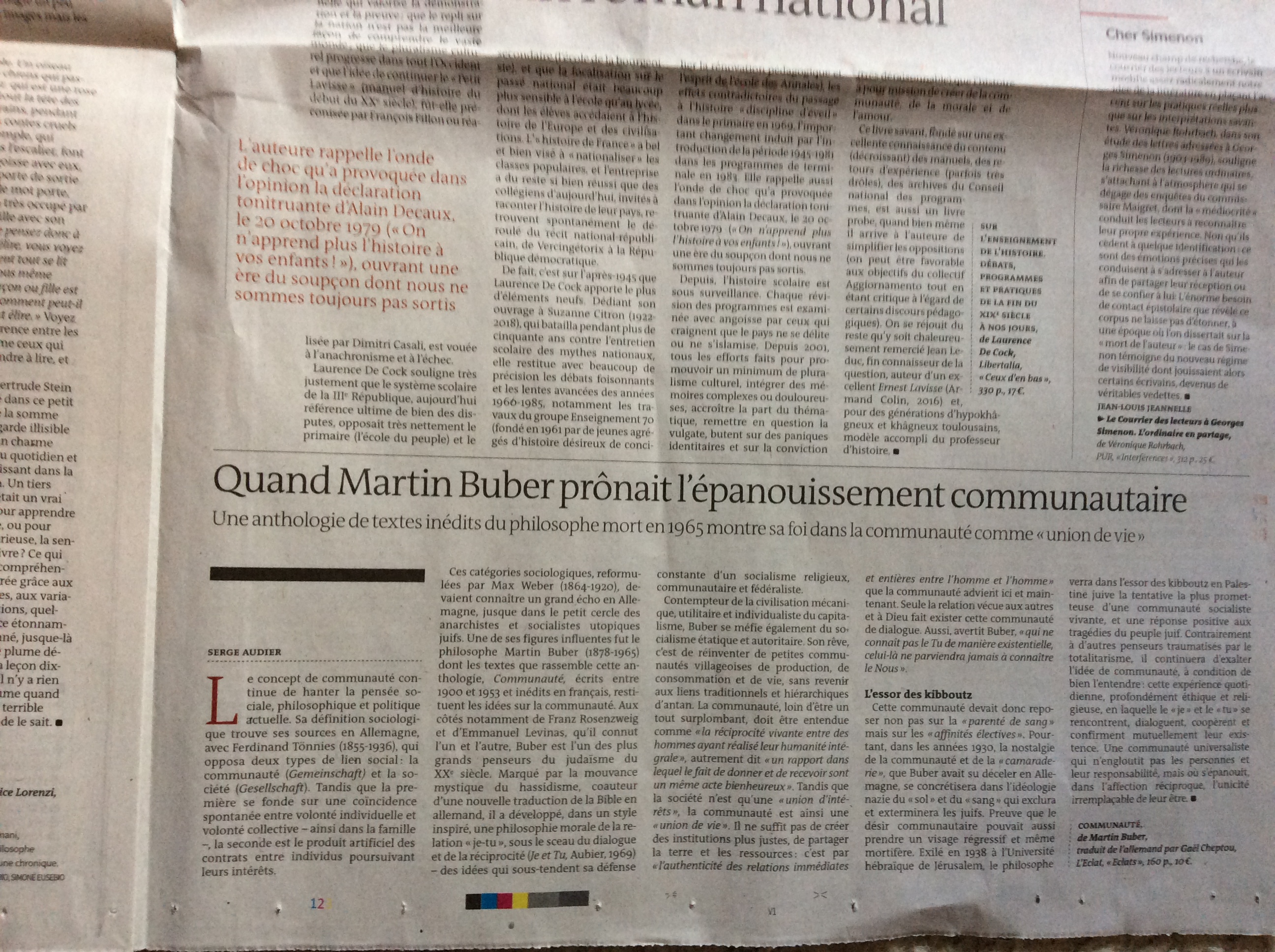 Compte-rendu, par Serge Audier, de Martin Buber, Communauté, in: Le Monde du 10-11 mai 2018. Quand Martin Buber prônait l’épanouissement communautaire. Une anthologie de textes inédits du philosophe mort en 1965 montre sa foi dans la communauté comme « union de vie ». Lire la suite (Image)